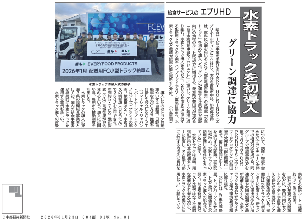 20260123_中部経済新聞 給食サービスのエブリHD 水素トラックを初導入 グリーン調達に協力