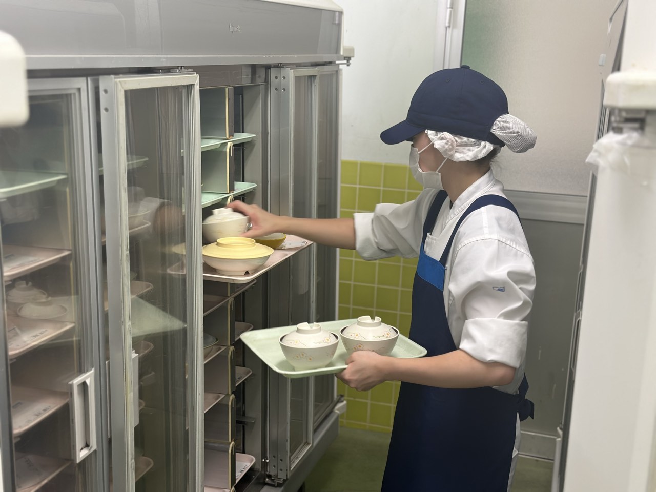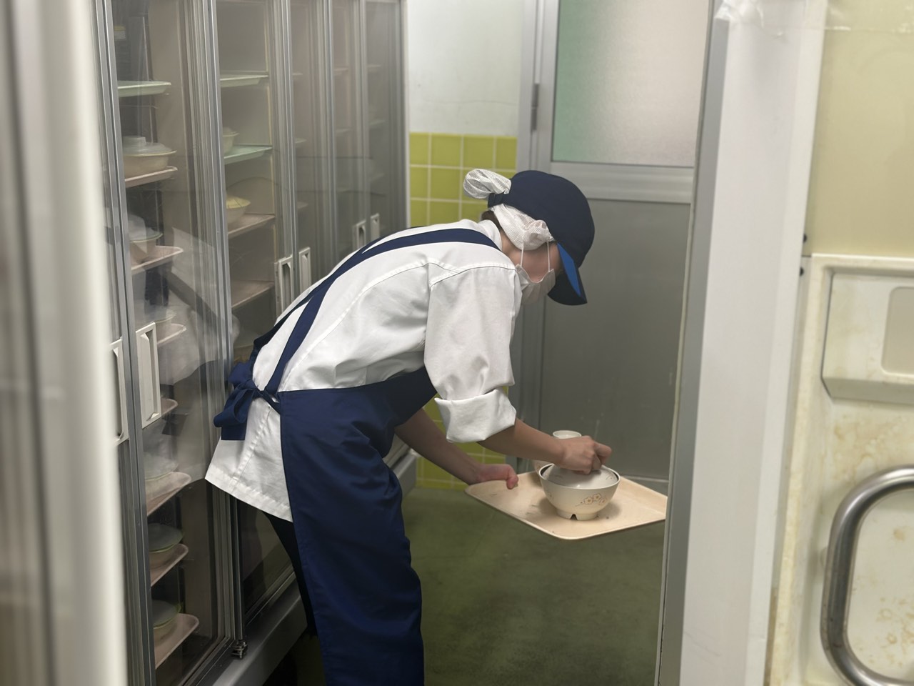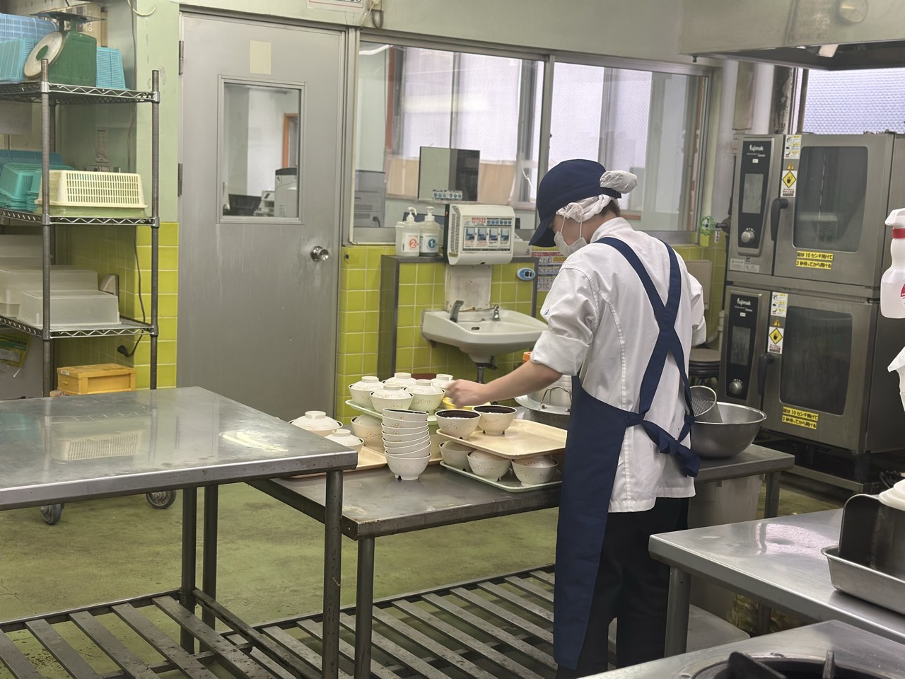 現在の私の勤務時間は、9時に出社して18時まで、または11時から20時までの2通り。仕事内容は調理・盛り付け・配膳・洗浄業務を主に担当しています。配属先の病院では1日約100食、併設の介護老人保健施設では約90食を提供していて、朝4人、昼8〜9人、夜4人体制で働いています。メンバーは幅広い年齢層で、みんなとても優しい人ばかりです。
