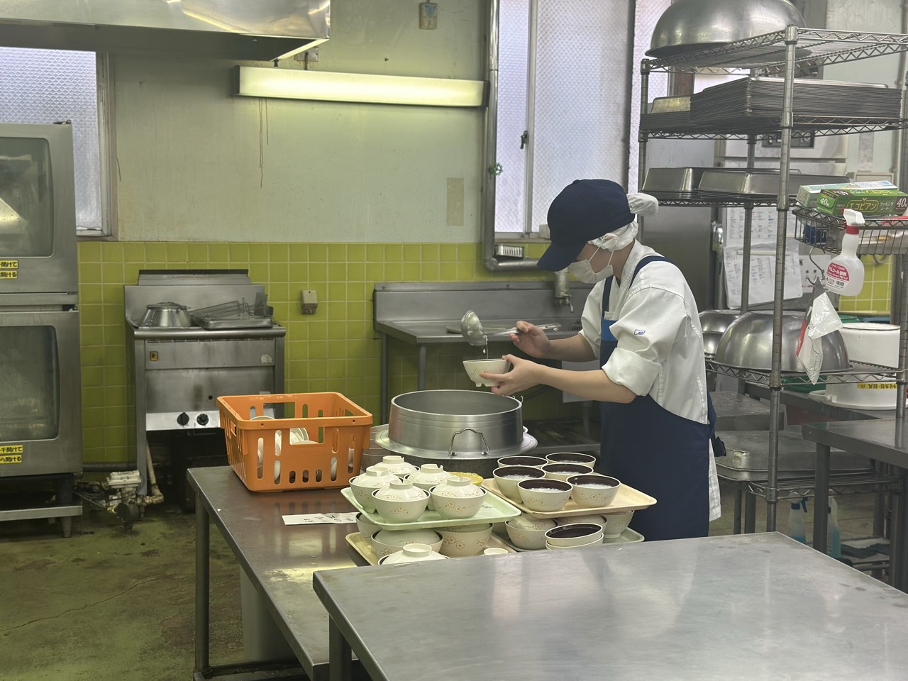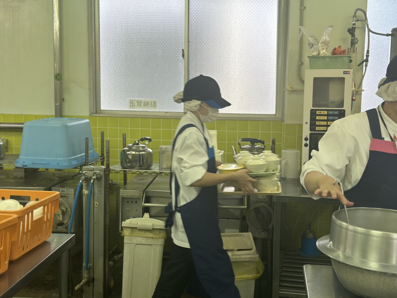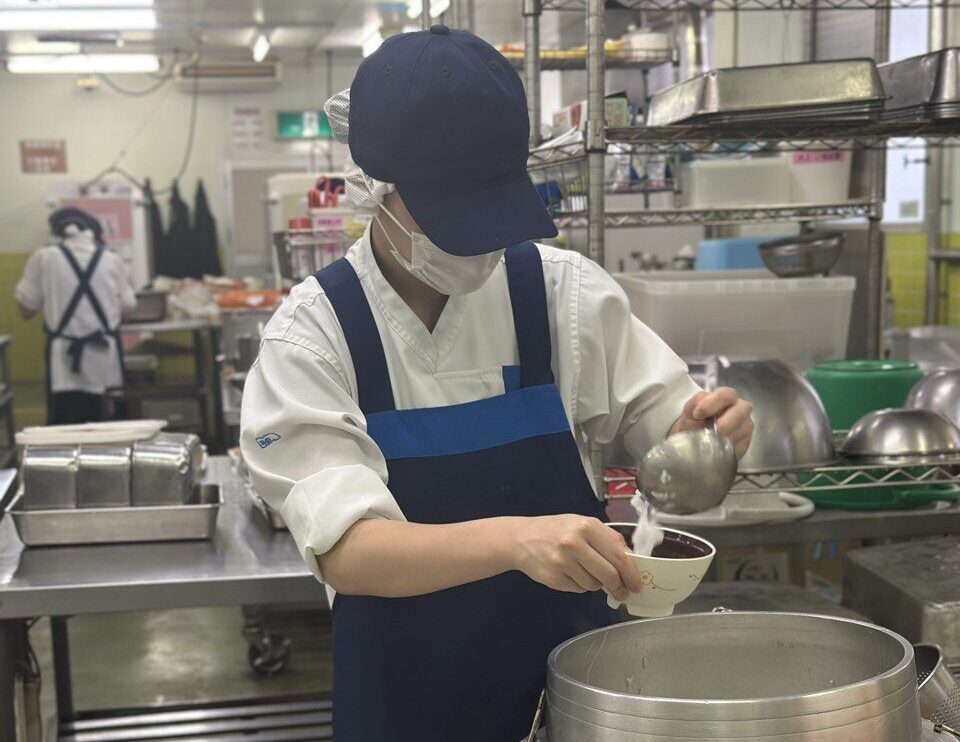 現在の私の勤務時間は、9時に出社して18時まで、または11時から20時までの2通り。仕事内容は調理・盛り付け・配膳・洗浄業務を主に担当しています。配属先の病院では1日約100食、併設の介護老人保健施設では約90食を提供していて、朝4人、昼8〜9人、夜4人体制で働いています。メンバーは幅広い年齢層で、みんなとても優しい人ばかりです。