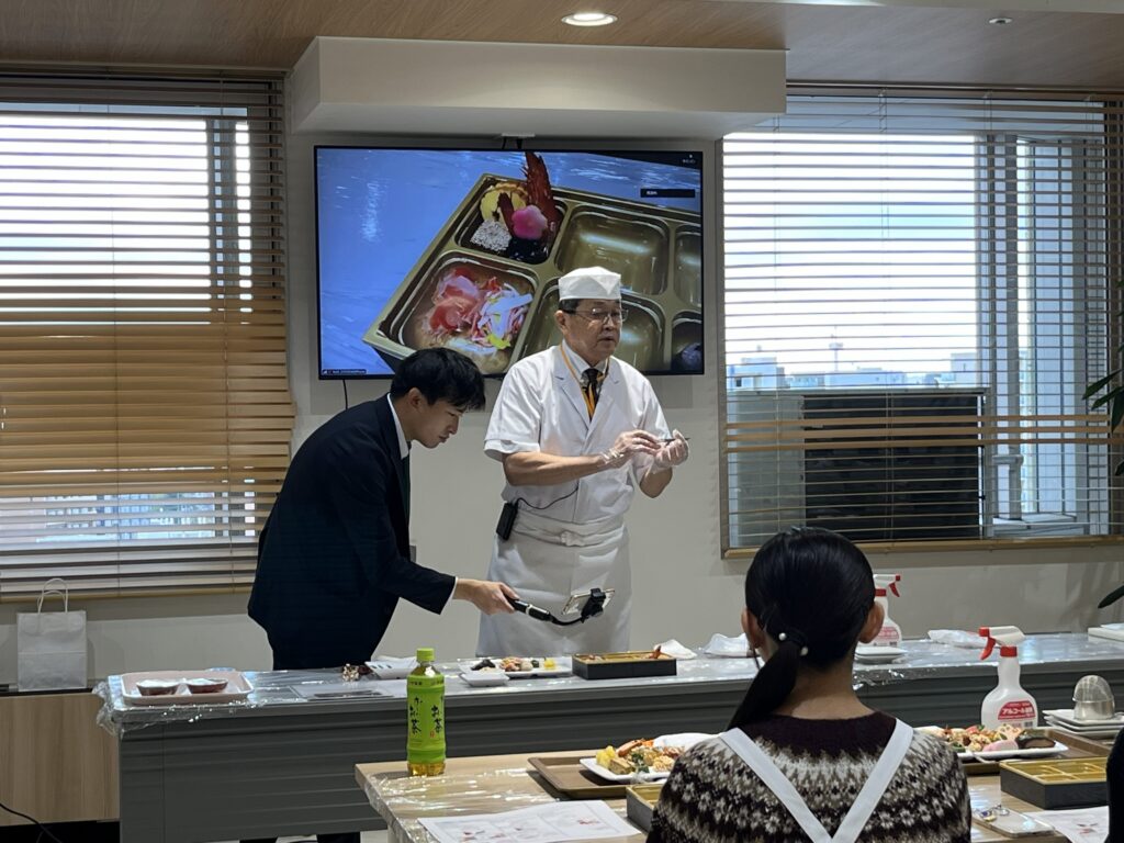 名古屋本社 管理本部 人材開発部 調理師の松浦部長、営業本部 営業企画部 業務支援グループの小林技術顧問(スペシャルマイスター)からそれぞれの料理の作り方や盛り付けを、説明いたしました。