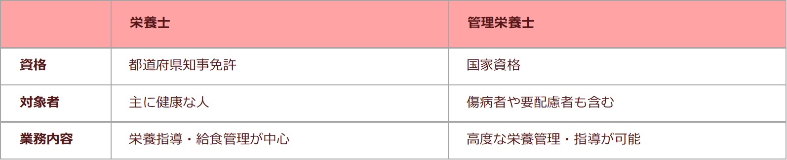 ・資格:栄養士は、都道府県知事の免許を受けた資格、管理栄養士は厚生労働大臣の免許を受けた国家資格